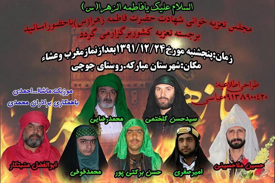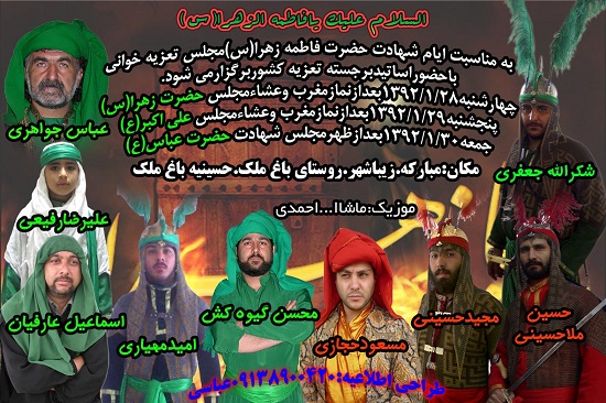 مجلس تعزیه خوانی شهادت عباس (ع) توسط استادحسین طاهری ودیگرذاکرین برگزارمی گردد موزیک:نورالله سروانی زمان:جمعه4/12/91ساعت9صبح مکان:تکیه بزرگ بیت العباس شهرخورزوق مجلس تعزیه فتح خیبر ذاکرین:استاد حاج محمد رضایی-حاج اکبر اعظمی-مهدی قدیری ابوالفضل کواکبیان -شکر الله جعفری ودیگرذاکرین . موزیک:ماشاءالله احمدی زمان:جمعه4/12/91 ساعت۱۳:۳۰بعد از ظهر مکان :حسینیه سید الشهداءآدرگان(زیباشهر)شهرستان مبارکهبرچسبها: اعلام تعزیه, فتح خیبر, آدرگان