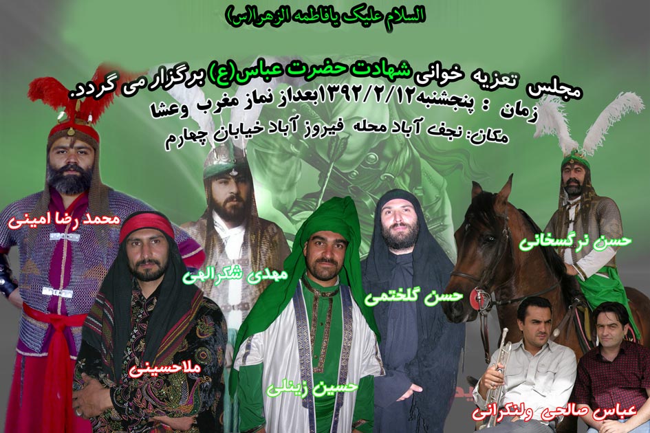 باسلام خدمت دوستان درتعزیه بهرام آباد این هفته۱۳/۲/۹۲ آقای محسن گیوه کش درنقش عباس(ع) ایفای نقش می کنند. قابل توجه دوستان زیادی که سوال فرمودند فیلمبردار این مجلس استودیو مهدی می باشد