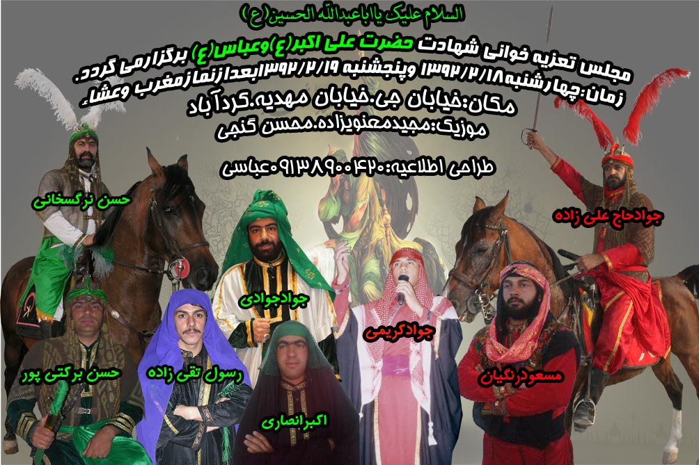 مجلس شهادت عباس(ع) حسین قربانی.محسن گیوه کش.اکبراعظمی.علی عرب و... موزیک:حسین ادیب زمان:جمعه20/2/92ساعت3بعدازظهر مکان:خیابان زینبیه.محله دارک