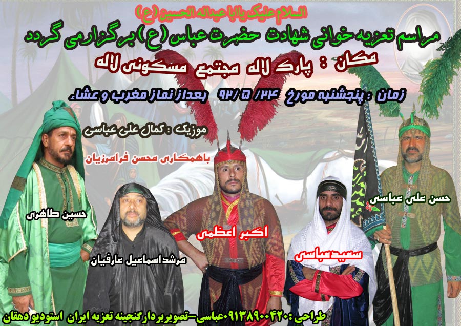 مجلس تعزیه خوانی شهادت حضرت عباس(ع) ذاکرین:استادحسین طاهری-حسن علی عباسی-مرشداسماعیل عارفیان علی عکاف-حمیدشیخی-مهدی زارع و.. موزیک:نورالله سروانی زمان:پنجشنبه31/5/92بعدازنمازمغرب وعشاء مکان:شهر گز برخوار-تکیه ملاهاشم مجلس تعزیه خوانی شهادت حضرت عباس(ع) ذاکرین:حسین زینلی-علی معینی و... موزیک:اسماعیل رنجکش زمان:جمعه1/6/92ساعت4بعدازظهر مکان:دولت آباد برخوار-کربکند-تکیه کربکند
