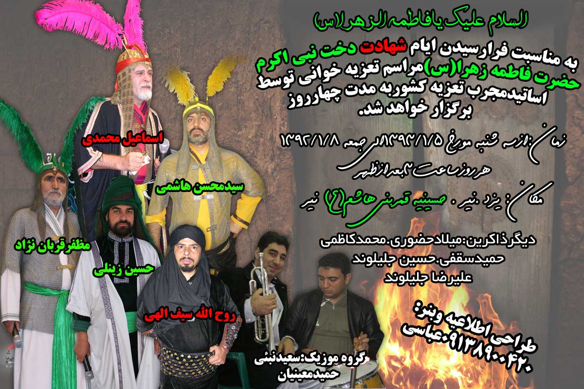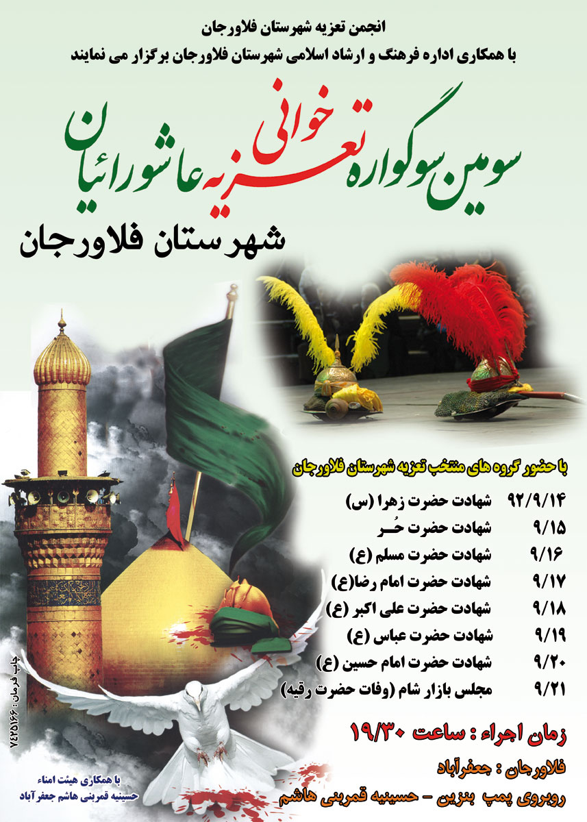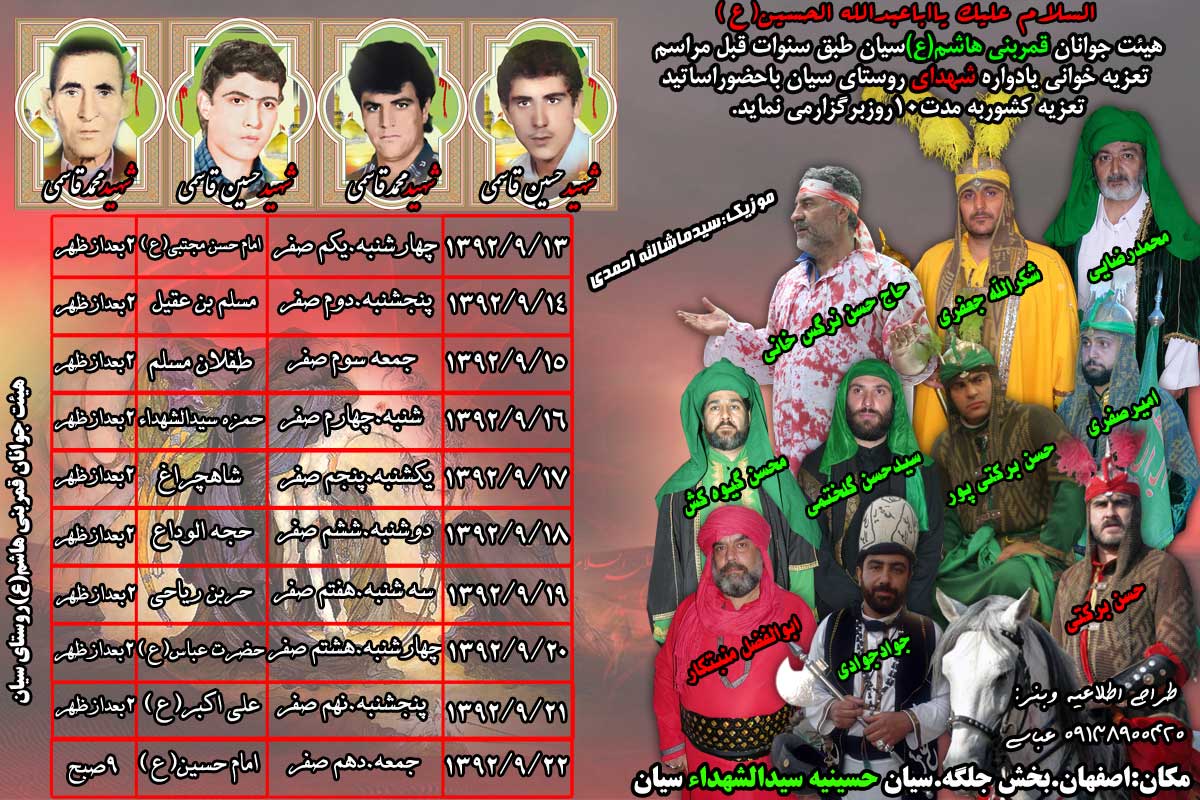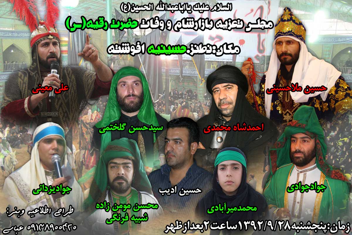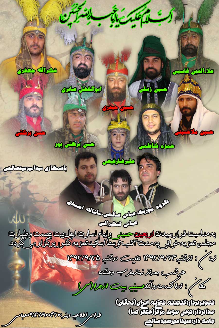 مجلس تعزیه خوانی شهادت علی اکبر(ع) توسط:رسول تقی زاده.حسین زینلی.جوادجوادی.علی معینی و... زمان:جمعه15/9/92ساعت یک ونیم بعدازظهر مکان:شهرستان برخوار.تکیه کربکند