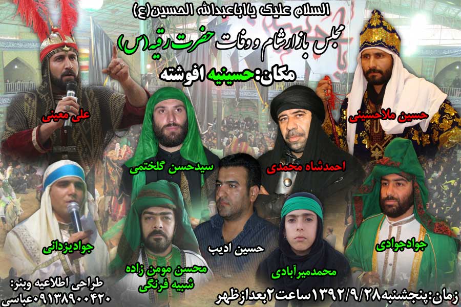 مجلس تعزیه خوانی شهادت عباس(ع)وعلی اکبر(ع) یادبودحاج برزوجمشیدی ناصرسلطان رضایی برگزارخواهدشد. ذاکرین:حاج حسن نرگس خانی-حسن برکتی پور رسول خدابخش و... موزیک:ماشالله احمدی زمان:پنجشنبه5/10/92بعدازنمازمغرب وعشاء مجلس عباس(ع) جمعه6/10/92صبح ساعت9مجلس شهادت علی اکبر(ع) مکان:اتوبان شهیدخرازی-ابتدای خیابان صمدیه لباف