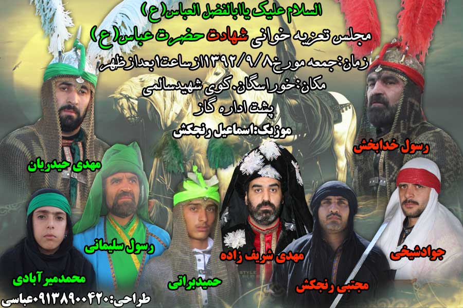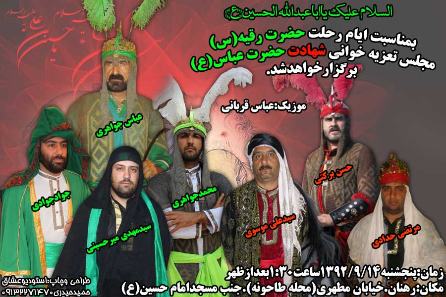 مجلس شهادت علی اکبر وامام حسین(ع) توسط استادحسین طاهری-رسول تقی زاده-مرشداسماعیل عارفیان حمیدشیخی-مهدی زارع ودیگرذاکرین موزیک:نورالله سروانی زمان:پنجشنبه۷/۹/۹۲ وجمعه۸/۹/۹۲بعدازنمازمغرب وعشاء مکان:خ امام خمینی-لیمجیر