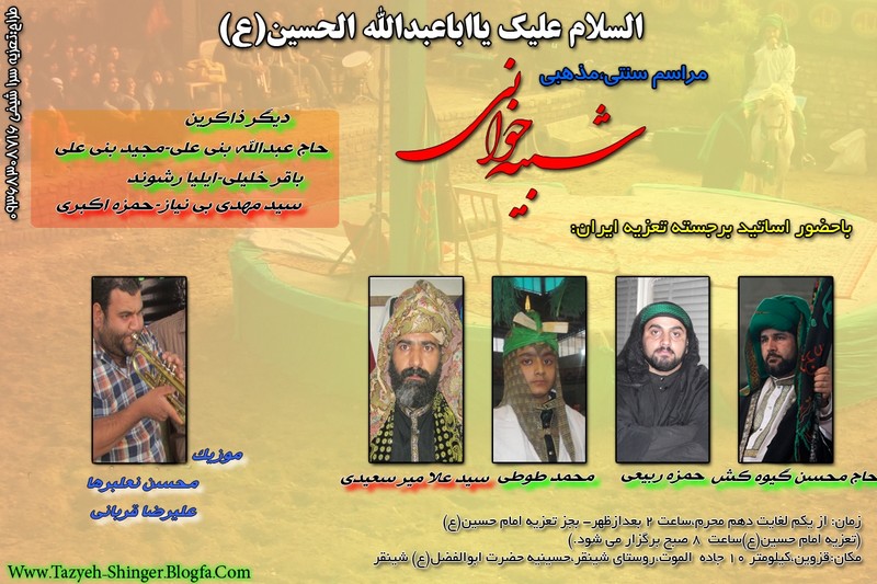 مجلس شبیه خوانی حضرت علی اکبر (ع) توسط گروه قاسم ابن الحسن برخوار شبیه امام : محمد جواد معینی ، شبیه علی اکبر : محمدرضا درّی شبیه ام لیلا : محمدرضا بوجاری ، شبیه حضرت زینب:حسین رفیعی