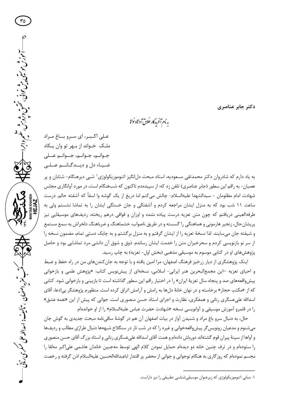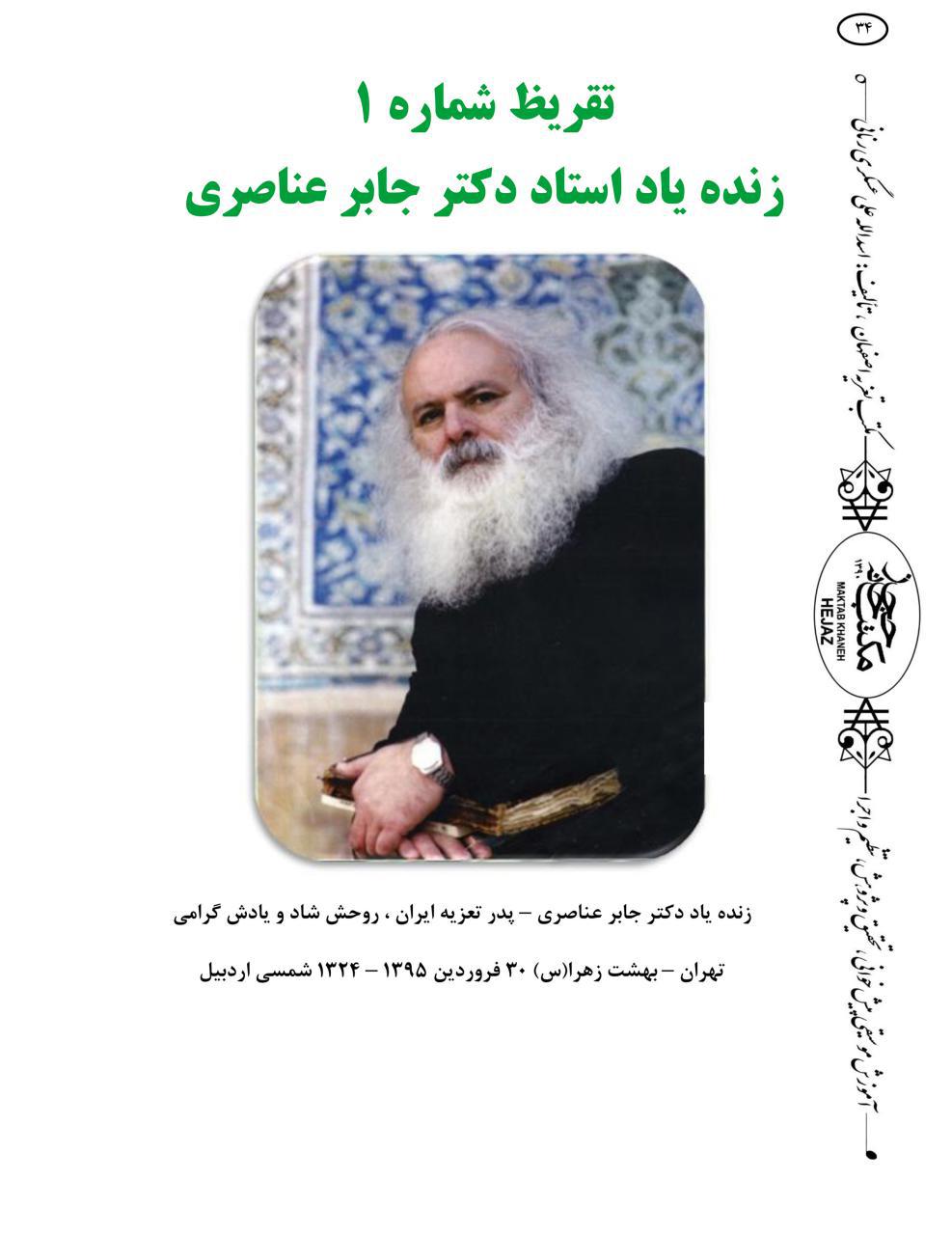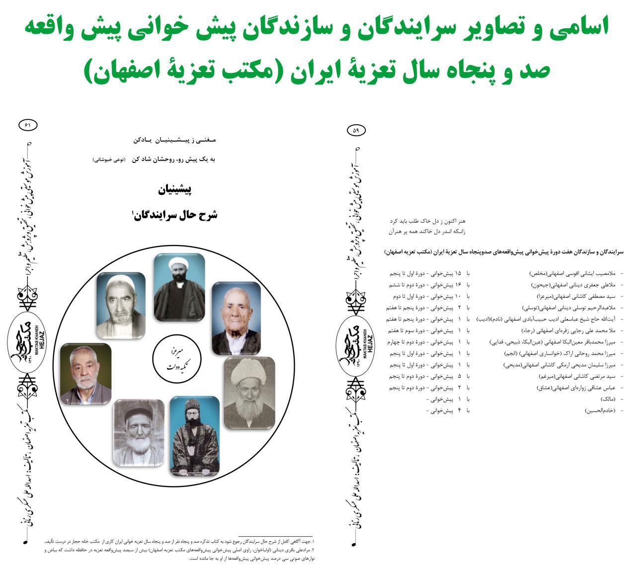 کتاب پیش خوانی پیش واقعه های صد و پنجاه سال تعزیه ی ایران نوشته ی استاد اسدالله علی عسگری رنانی که در پاییز ۱۳۹۵ با زبان فارسی انتشارات نقش نگین به چاپ رسیدصفحه ی عنوان :عنوان لاتین کتاب : صفحۀ توجه : صفخات فهرست کتاب :تقریظ مرحوم جابر عناصری:قیمت : ۶۵۰۰۰ تومان